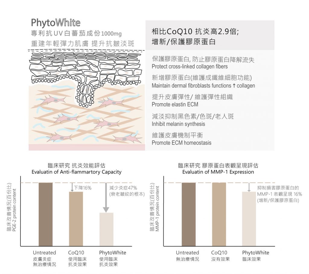 環境及紫外線是外在因素令皮膚發炎致老、產生皺紋色斑老人斑、失去膠原蛋白及彈性基礎。PhytoWhite 專利無色素類胡蘿蔔素, 研究顯示皮膚是儲存它們的最大器官, 使它們可在皮膚形成保護膜, 抵抗紫外線及環境傷害。同時, 研究顯示PhytoWhite 與CoQ10相比有效抗炎達2.9倍; 透過表觀遺傳路徑, 抑制損害膠原蛋白增新循環的MMP-1 Expression, 保護及維持年青健康肌膚的平衡基制, 保護及增新 膠原蛋白組織和彈性蛋白組織。